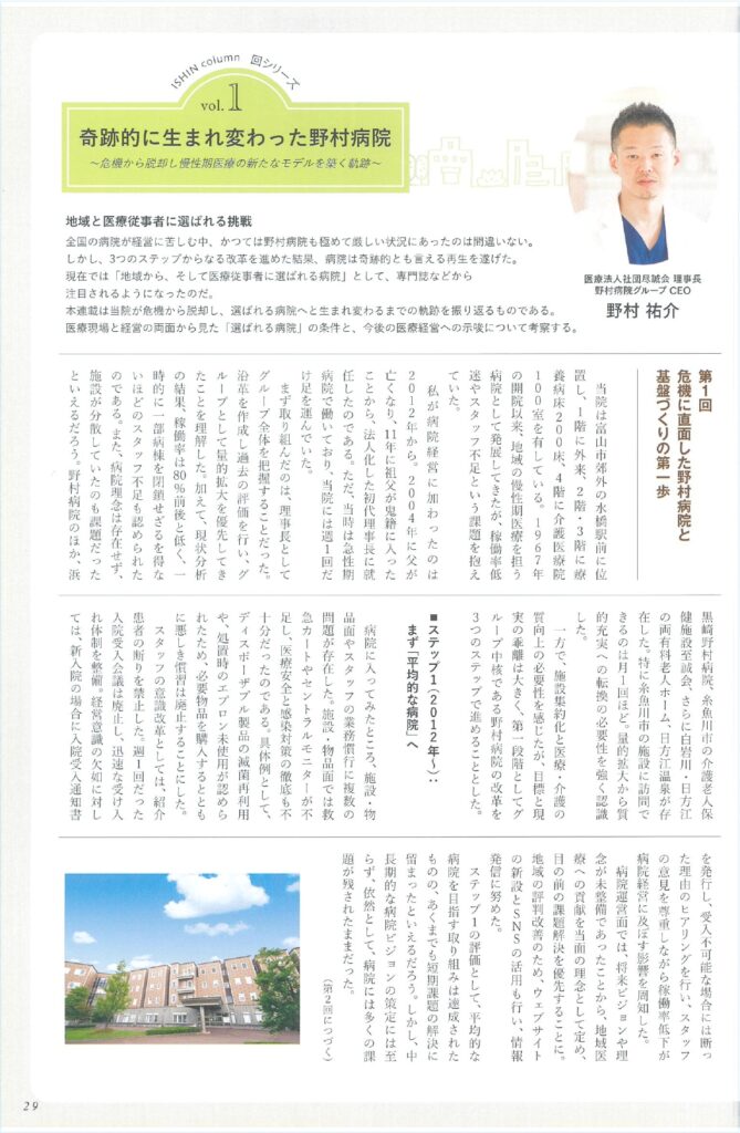 医療情報誌 医心 20259月号において、ISHIN column 奇跡的に生まれ変わった野村病院「vol.1 危機に直面した野村病院と基盤づくりの第一歩」が掲載されました。