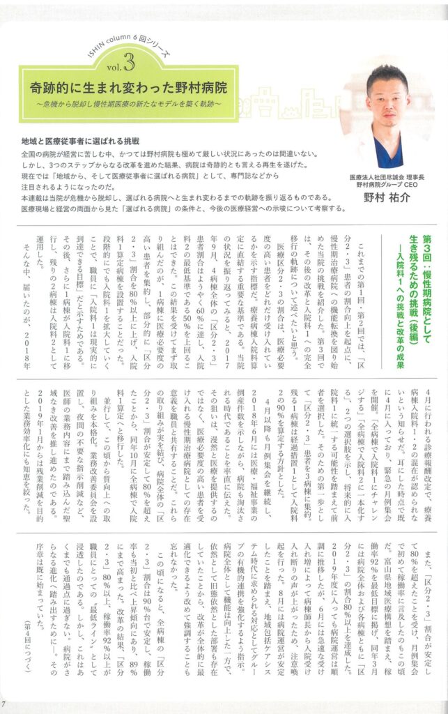 医療情報誌『医心』2026年1月号「ISHIN column」において「奇跡的に生まれ変わった野村病院 ~危機から脱却し慢性期医療の新たなモデルを築く軌跡~」vol.3が掲載されました