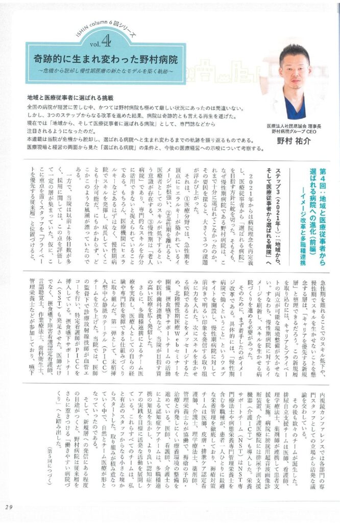 医療情報誌『医心』20263月号の「ISHIN column」において、連載コラム「奇跡的に生まれ変わった野村病院 ~危機から脱却し、慢性期医療の新たなモデルを築く軌跡~」vol.4が掲載されました。